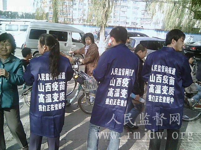 本图:中国公民志愿者上街发放山西高温变质疫苗告知卡