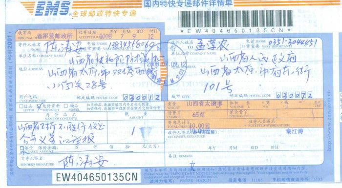 注:本申请书用特快专递寄出的邮局回执单及其本举报书全文,将及时发表在世界互联网 举报日期:2008年 7 月9日 联系电话: 通讯地址:山西省疾病预防控制中心(太原市双塔西街小南