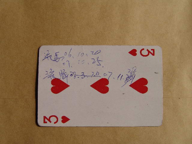 高径给记者展示的一张红桃3扑克牌上,有如下文字:“流感06.10.20、07.10.25 流脑07.11.28”。高径告诉记者,这是给省卫生厅提交材料前,找村防疫员时,对方随手在一张扑克牌上写的莉莉疫苗接种史。