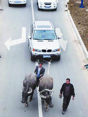 但并不是所有的宝马车主都这么幸运。在无奈之下,他们也作出了一些过激的行为,今年7月大连的一名宝马X5车主因为车子燃烧,得不到合理解决,只好用拖车拉着宝马出现在大连市区主要交通干道上,为自己维护权益。无独有偶,合肥一位宝马X5车主也因为质量问题得不到解决,花钱雇了两头水牛拉着宝马车上街。