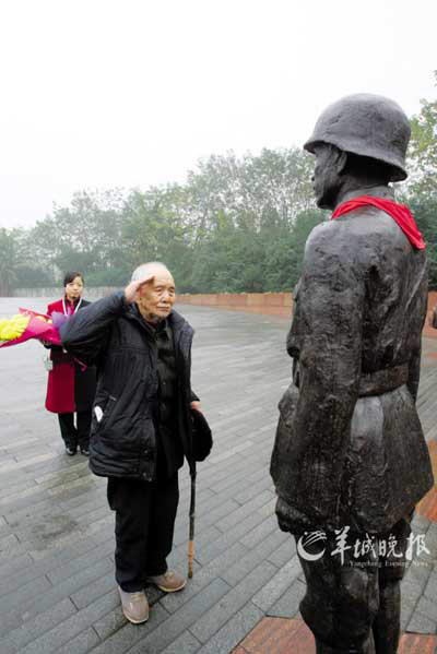“中国壮士1931-1945”群雕广场,他找到谢晋元的雕像,摘下手套,脱帽,立正,敬礼:“团长,部下杨根奎,第一营第二连第一排中尉排长。抗战(战斗)结束,退入英租界。我给您敬礼了。”在蒋中正的雕像前,老人深深鞠躬之后,肃然立正:“蒋委员长,部下杨根奎给您敬礼了……”随后,他又给周恩来、毛泽东、朱德的雕像依次敬礼。