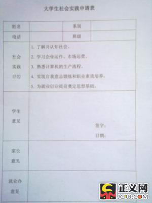 但是就在记者离开学校4个小时之后,有学生又向记者汇报了最新情况:“老师让我们必须填一张社会实践申请表,他们要求在‘学生意见’那一栏中必须写清楚‘自愿到富士康实践’。”