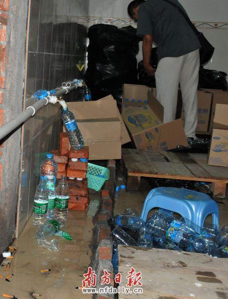 一制假团伙以出租屋为掩护,将自来水简单过滤后直接灌入塑料瓶内,并打上知名品牌标签,当矿泉水销售。日前,深圳市坪山警方成功打掉了这一制假售假团伙。据了解,今年5月下旬,深圳市坪山公安分局接到群众举报称,坪山一带存在一制售假冒矿泉水窝点。接报后,坪山警方立刻成立专案组展开调查。在辖区走访时,民警发现金碧路旁一栋7层在建农民房比较可疑。该栋楼房平时大门紧闭,没人人员出入,各个窗户均用报纸糊上,但晚上该栋楼会亮起灯光。民警观察发现,经常会有一辆人货车开到该栋农民房。经过调查民警发现,该辆车上装的都是一箱一箱的矿泉水。警方跟踪车辆,发现车上的矿泉水出了销售给周边小店之外,还会送至汤坑社区一出租屋存放。
