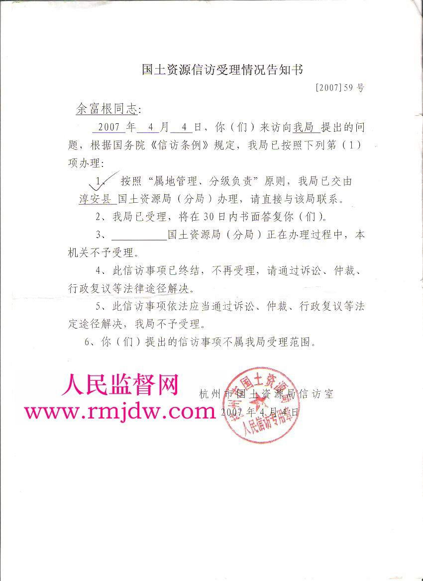 (3)前坞村的余富根,工业园区强行挖掉他的土地,也没有付一分钱,余富根没有办法阻止工地老板挖农田,因在余富根家里,村长吴顺发为他说了一句公道话:“挖掉的土地确实没付钱”,但却遭到一批流氓恶棍的拳打脚踢,把吴顺发打成轻伤,住院50多天才好。另外把余富根的价值十几万元的货船强行报废,一分钱不赔。余富根为上访把船抵押给别人,无处可住、流落街头,乞讨为生。第一次在2006年10月10日到北京上访,被浙江省办事处抓住,然后淳安县千岛湖镇董××、信访局王××、前坞村书记吴××去北京把我带回淳安。第二次,2007年1月5日到北京中央信访局48号接待室,他们材料都不看,叫我到省里去。2月15日余富根到中央水利部上访,他们却不收材料说:“中央不管水库”,2月25日余富根再次到中央水利部及中央国土部信访局,但他们始终不收材料。第三次2007年7月10日,余富根又一次到北京中央水利部,但它们还是不收材料。2008年余富根把劈山填湖的有关资料寄到中央建设部、水利部监督科及中央检察院也毫无结果,余富根为阻止园区非法劈山填湖,从县到市、省相关部门全部跑遍,但他们都互相推诿,此事毫无结果,甚至到华东电力公司但得到的答复是他们是企业管不了水库。据余富根调查所知,淳安县工业用地30公顷,范围365平方公里(全水域)却上报还不到四分之一,对上报,地方政府是按国家相关政策给征用土地的百姓如何安置,对园区开发经过中央批准同意开发的,要他们拿出文件向百姓公开,他们却不同意,实际就是弄虚作假、欺上瞒下。关于上告一事,2007年八月中旬县委王主任、县委徐秘书说你是淳安的公民,为什么把淳安告倒。我问千岛湖镇书记王昌迪农民承包的土地自己有没有自由权,得到的答复是土地是集体的农民无权作主,反而要我滚出去。陈志华副镇长找我谈话,叫我不要上告,但就是不给老百姓解决问题。本人原来开船维生,船也被强行停开,为了维护自己的权益,上下跑来跑去,化光所有集蓄不算,到处借帐,本人现无家可归,借住朋友船上,过着非人生活。本人到处上告,到过国家信访局、水利部、国土资源部、以及省市有关部门,但至今没有处理。上访材料寄遍各有关部门,都在推卸责任。