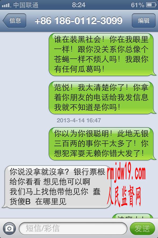图:中南海高官范悦、浙商金忠等人向纪英男讨债的短信截图
