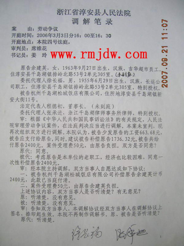 2007年8月29日,淳安县人民法院打电话给原告余建英,叫她到法院去。到法院以后,法院立案厅厅长杜伟明,审监庭庭长程英凤,被告杭州千岛湖松城饭店有限公司总经理程德初,被告代理人张承进正在等候。张承进交给余建英一份他们早已写好的协议,要余建英照样抄一份,余建英抄好以后,张承进将原稿撕掉。陈德初从包里拿出5000元人民币交给余建英。协议的主要内容是被告补助给原告5000元人民币,但前提条件是叫原告息诉,从此不要再向本院(淳安县人民法院)申诉。