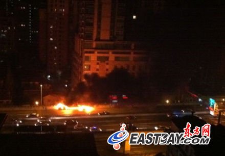 22日晚11点30分左右,延安路高架凯旋路段发生车祸。据现场目击者称,三车相撞后其中一车自燃,并有目击者拍照上传网络。晚11:40分许,网上已可见起火现场照片,引发网友关注、转