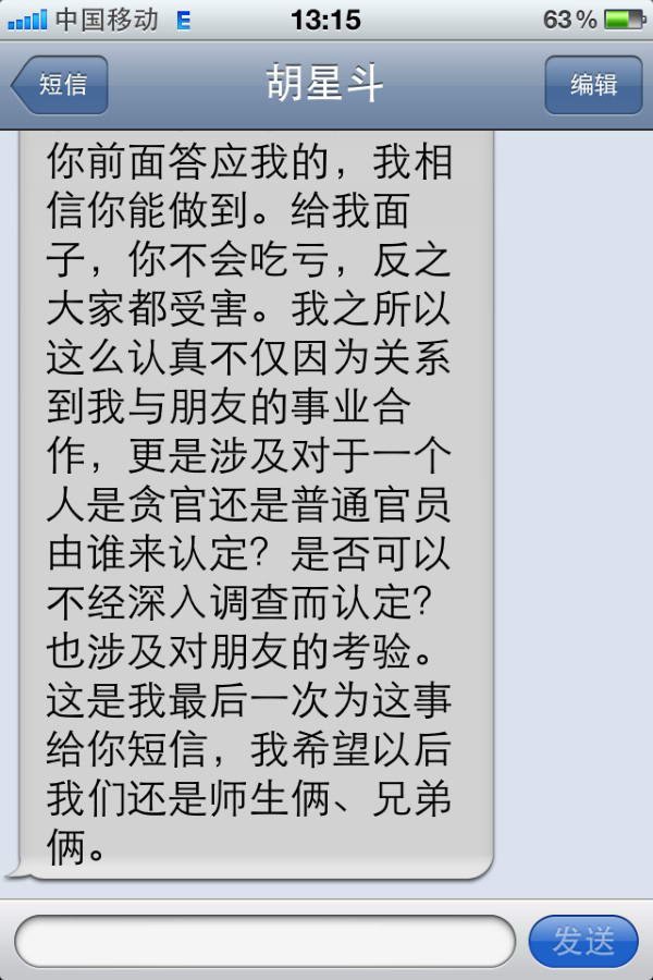 七、2011年9月24日18点55分,胡星斗教授发来手机短信:瑞峰:我希望你近两天把李波删除吧。你认准了李波是贪官,有证据吗?深入调查了吗?仅凭养狗和个别人的言论?你这样做太危险了,李波其实是一块肥肉。我俩就不要争论谁是真正的反腐败了,你知我知。我不希望我俩兄弟分裂,我们兄弟的分裂会立即让微博和所有的记者、朋友热议。你前面答应我的,我相信你能做到。给我面子,你不会吃亏,反之大家都受害。我之所以这么认真不仅因为关系到我与朋友的事业合作,更是涉及对于一个人是贪官还是普通官员由谁来认定?是否可以不经调查而认定?也涉及对朋友的考验。这是我最后一次为这事给你短信,我希望以后我们还是师生俩、兄弟俩。