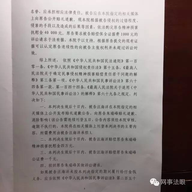 今天我的一个群友,也是著名调查记者朱瑞峰披露了针对他个人进行网络人身攻击的案件。该案件在日前经北京市西城区人民法院名誉侵权诉讼程序审理后,获得判赔4万元。从判决书上可以看到侵权人名叫汪海洋,通过天涯社区等网站对朱瑞峰进行人身攻击和诽谤。
