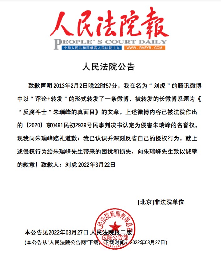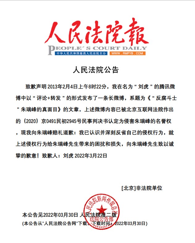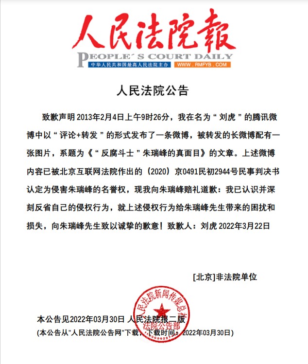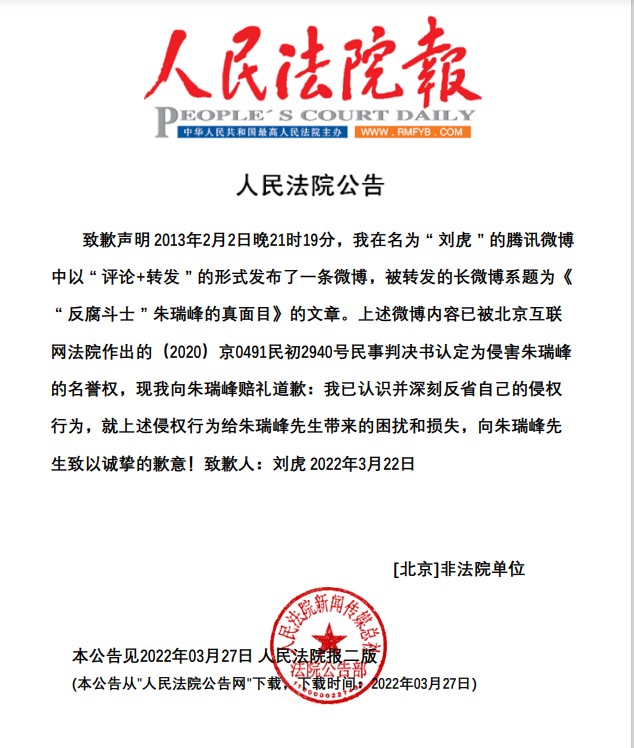 岁月不居,江河无恙!日前,经北京互联网法院执行局审核,著名新闻制造专家、著名舆论引导员、雷政富等21名贪官的御用网络打手刘虎,于2022年3月27日、3月30日分别在人民法院报第二版刊登4次道歉声明,向朱瑞峰赔礼道歉!并赔偿迟延履行金。