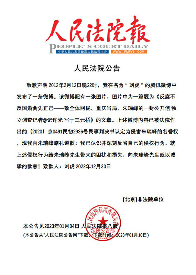 自媒体人刘虎在道歉声明中称:“我已认识并深刻反省自己的侵权行为,就上述侵权行为给朱瑞峰先生带来的困扰和损失,向朱瑞峰先生致以诚挚的歉意!”(详见人民法院公告网:https://rmfygg.court.gov.cn/web/rmfyportal/noticeinfo?content=%E6%9C%B1%E7%91%9E%E5%B3%B0 )