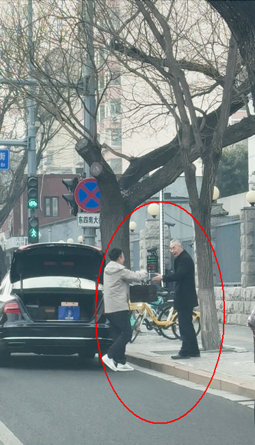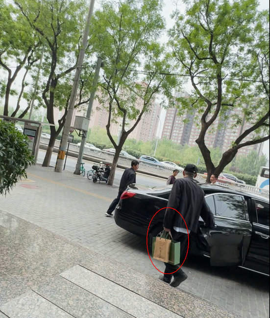 图九:阎红革手拿礼品乘坐驻京办黑色红旗轿车(京LJW126)回家